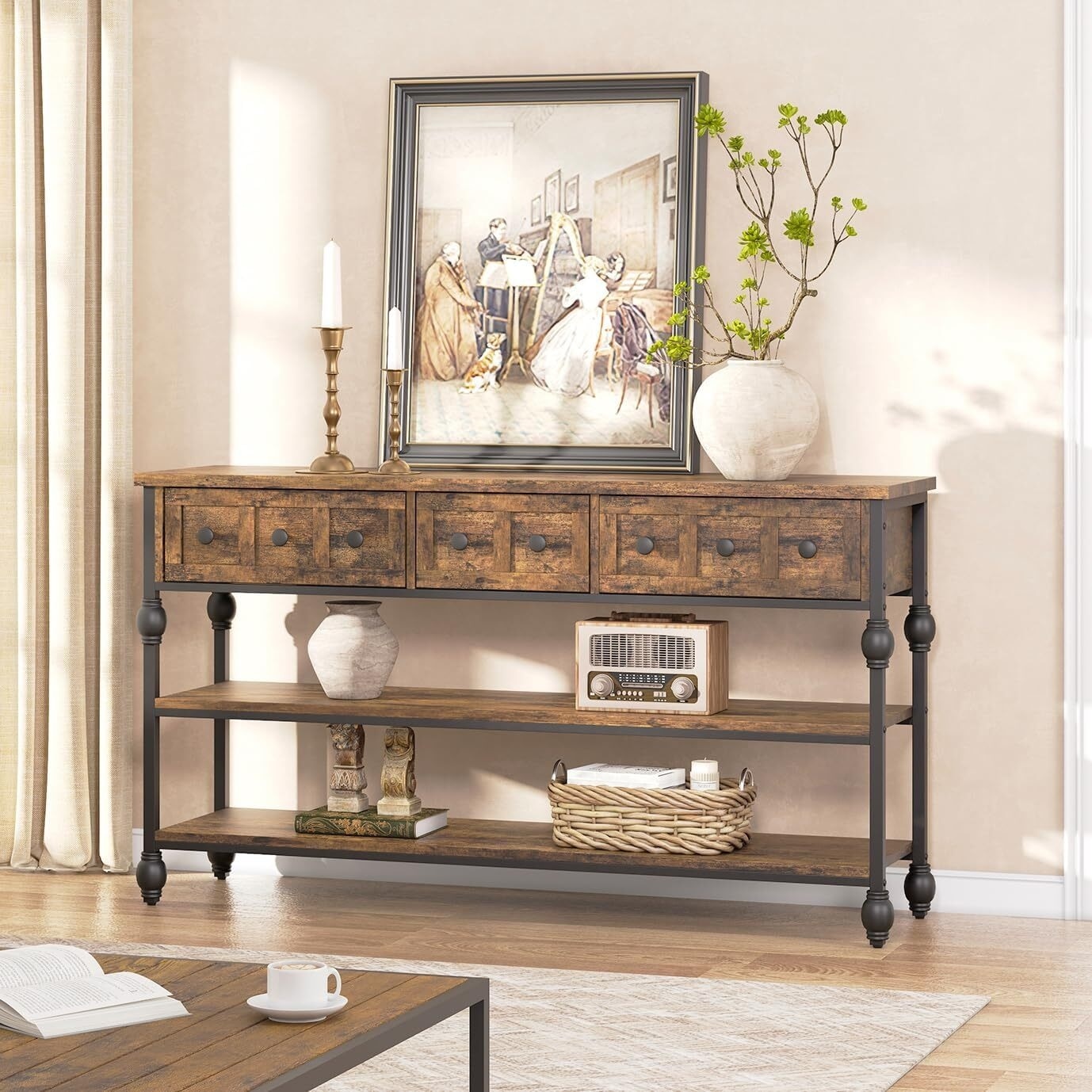 52" Console Table, Entryway Table with 3 Storage Drawers, 3 Tier Industrial Metal Sofa Table, Hallway Table for Entry - 52.56in