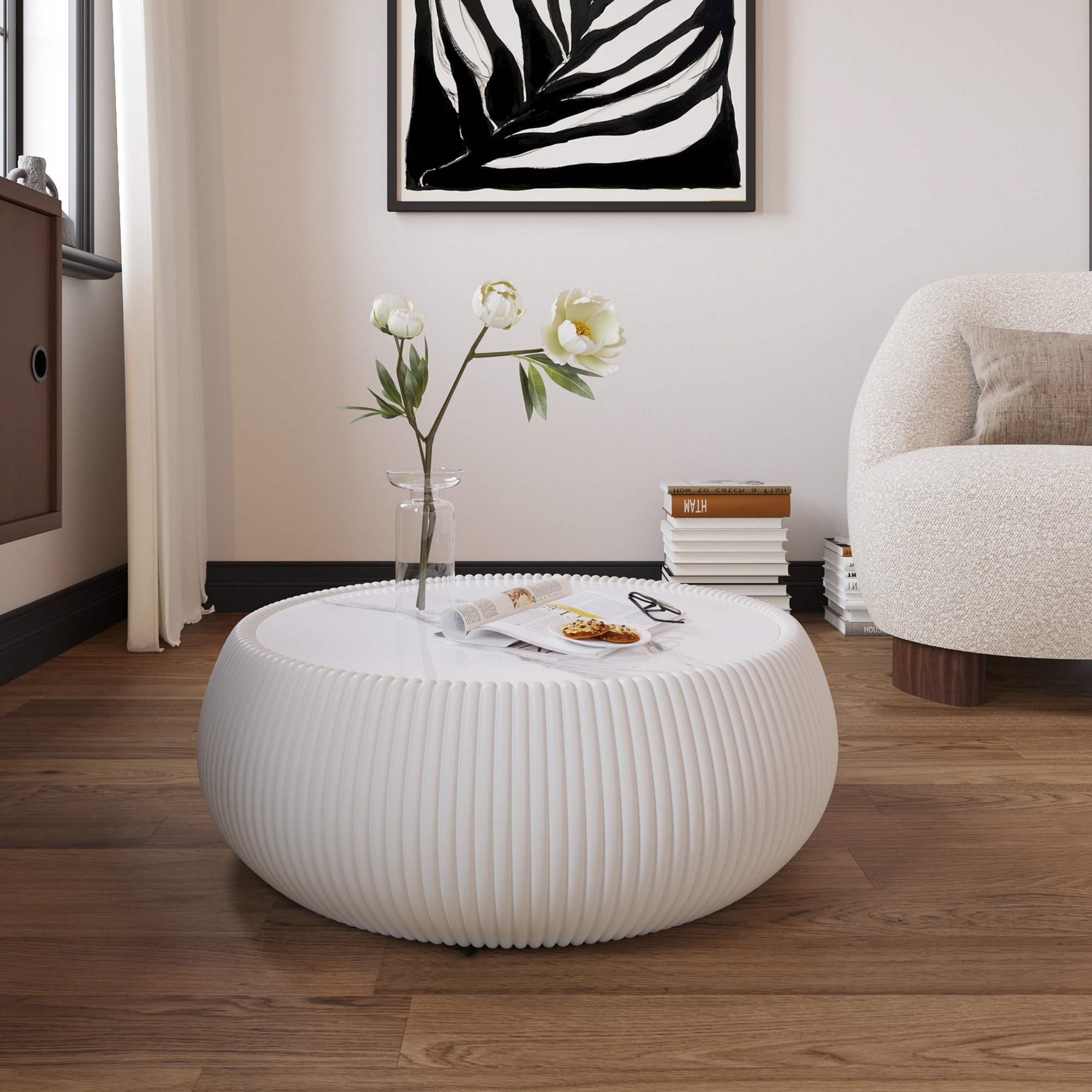 Light Marble Top Drum Shape Leather Coffee modern Sofa Table