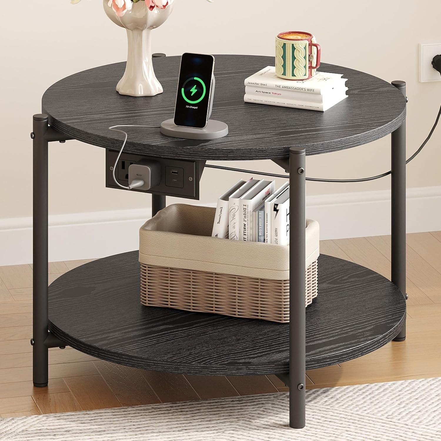 Round Coffee Table with Charging Station and Storage Shelf, Modern Design for Living Room, Bedroom, Office