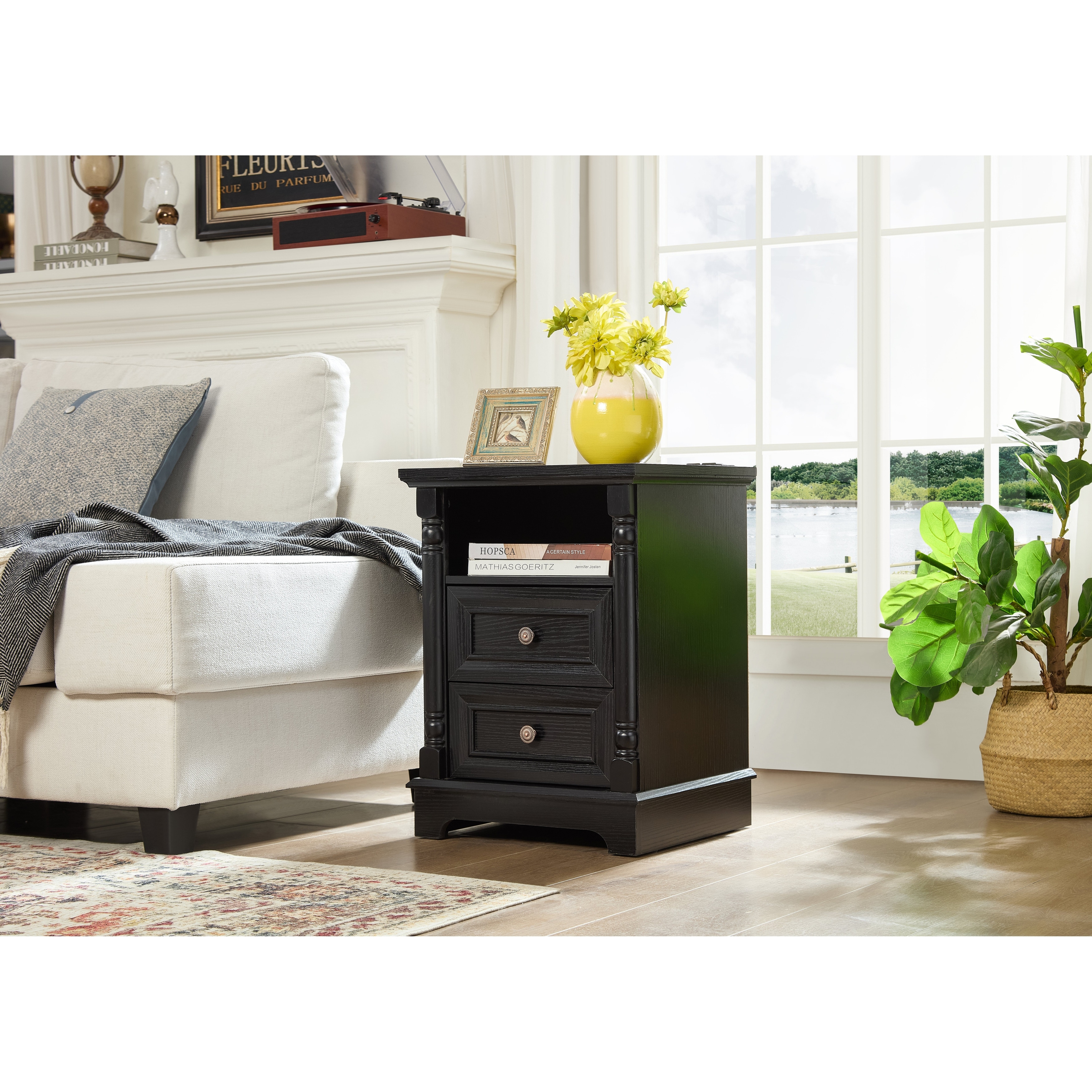 Anmytek Farmhouse Side Table with 2 Drawers, Open Shelf and Charging Station