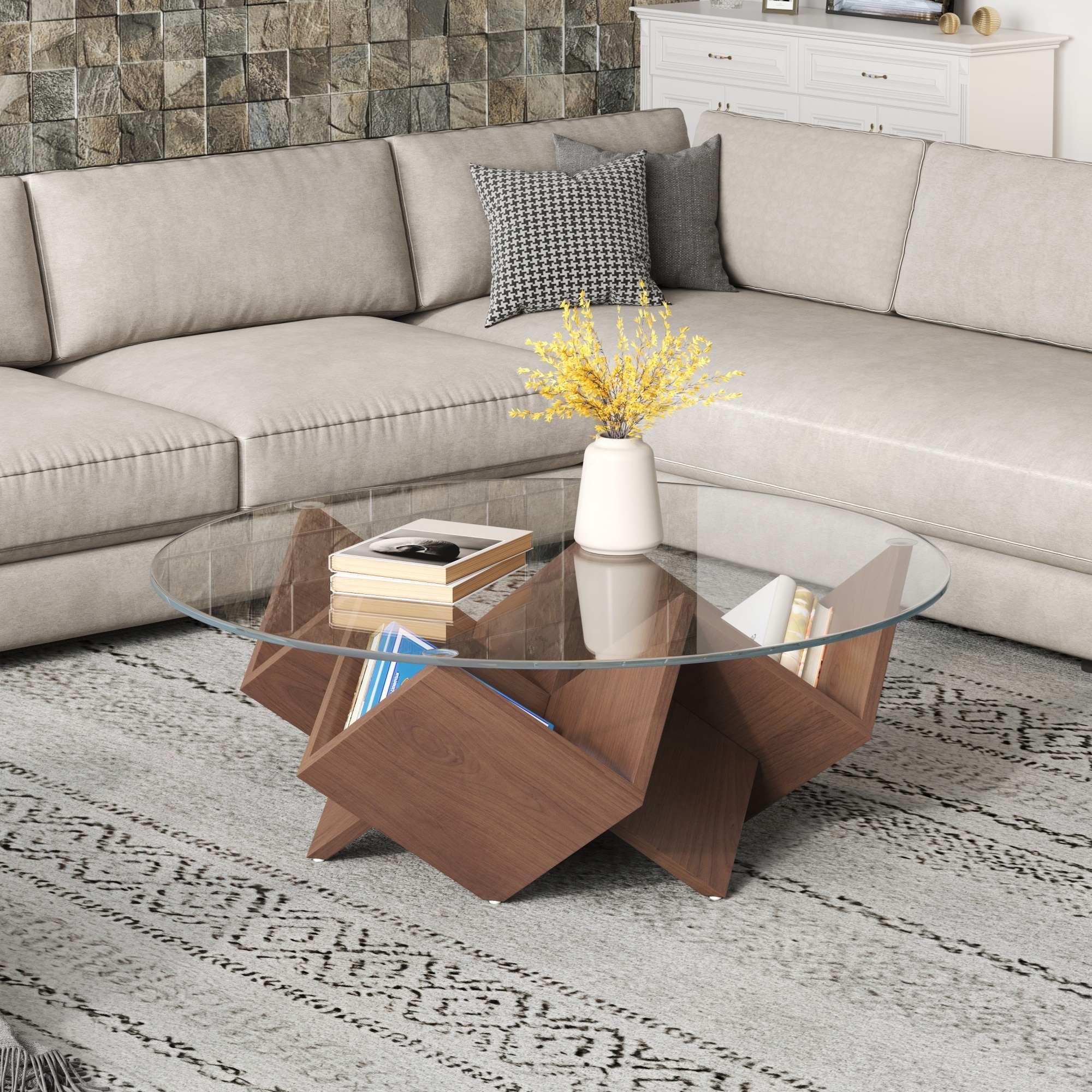 Round Coffee Table with Glass Top and Geometric Abstract Art Deco Base Storage Shelves