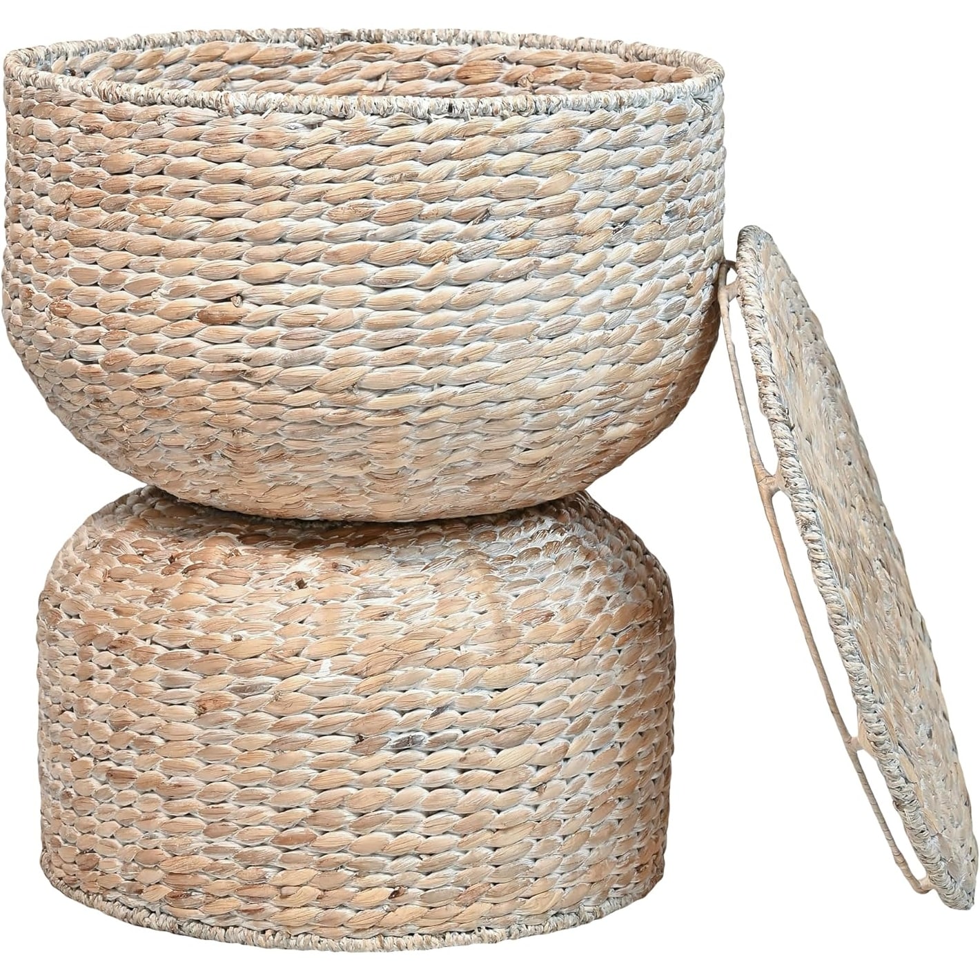 18-inch White Wash Hyacinth Woven Storage Accent Table with Removable Lid for Bedroom, Living Room, Kitchen, and Dining Room