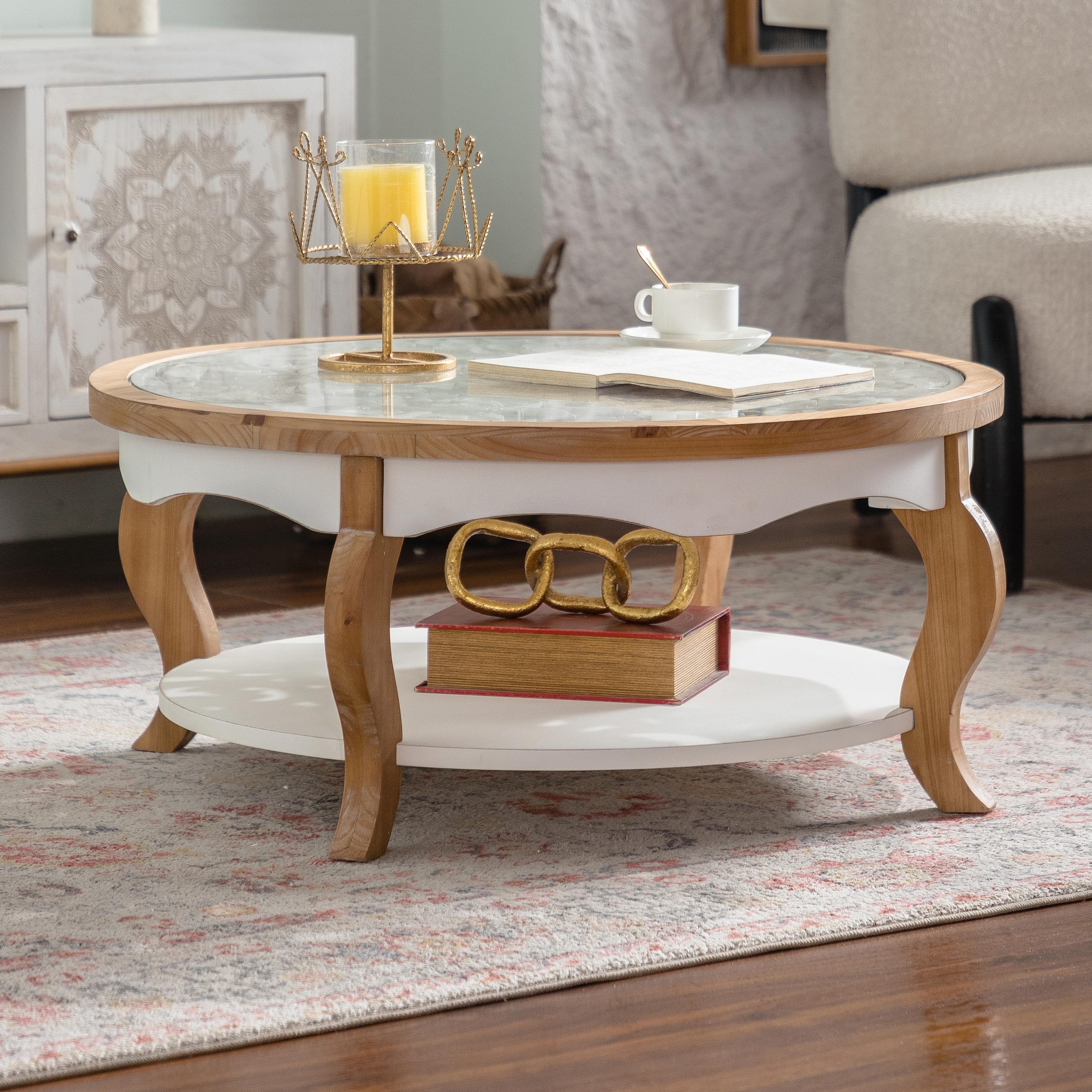 Round Wood Coffee Table with Glass Top - Curved Legs