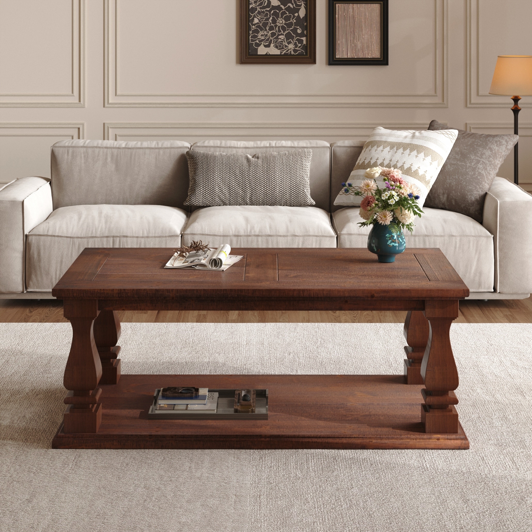 Farmhouse Coffee Table, Crafted with Heavy Planked Top & Square Baluster Legs