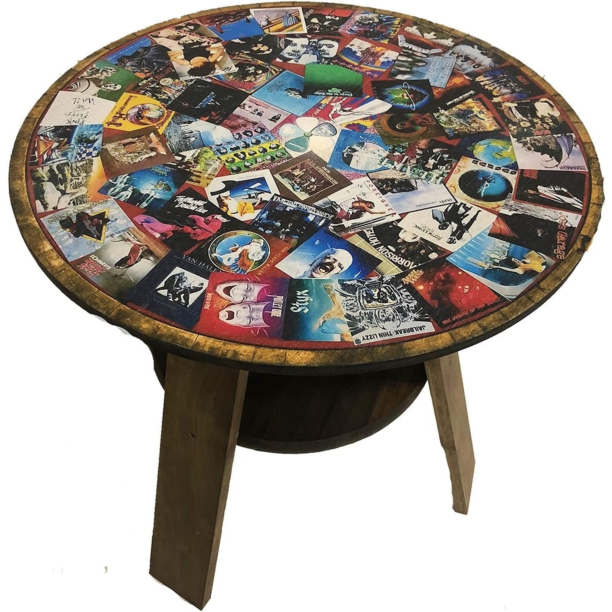 Round Rustic Wood Music End Table with Shelf for Man Cave Living Room Decor