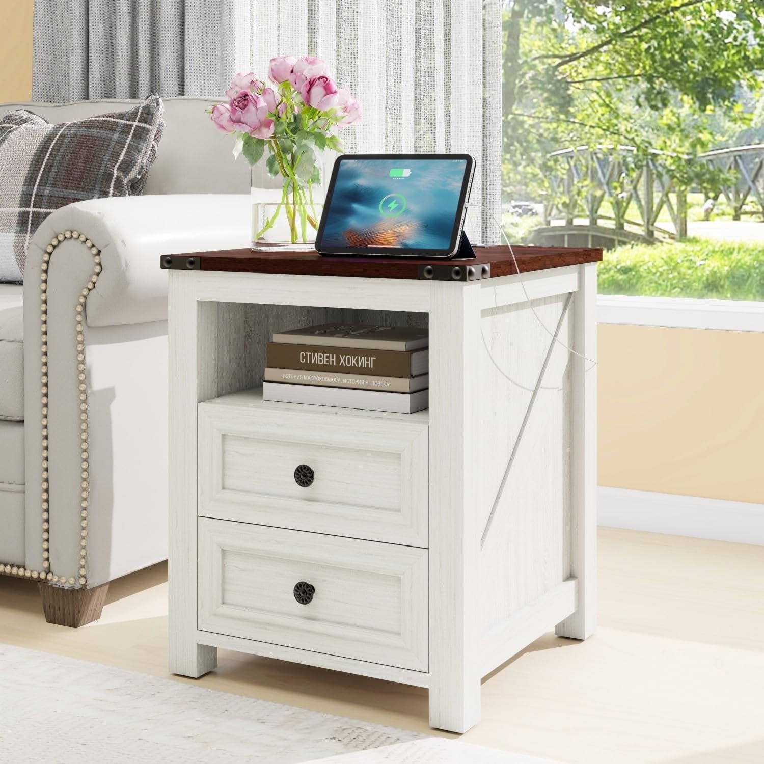 Rustic Nightstand with Charging Station, 2 Drawers, and Open Shelf