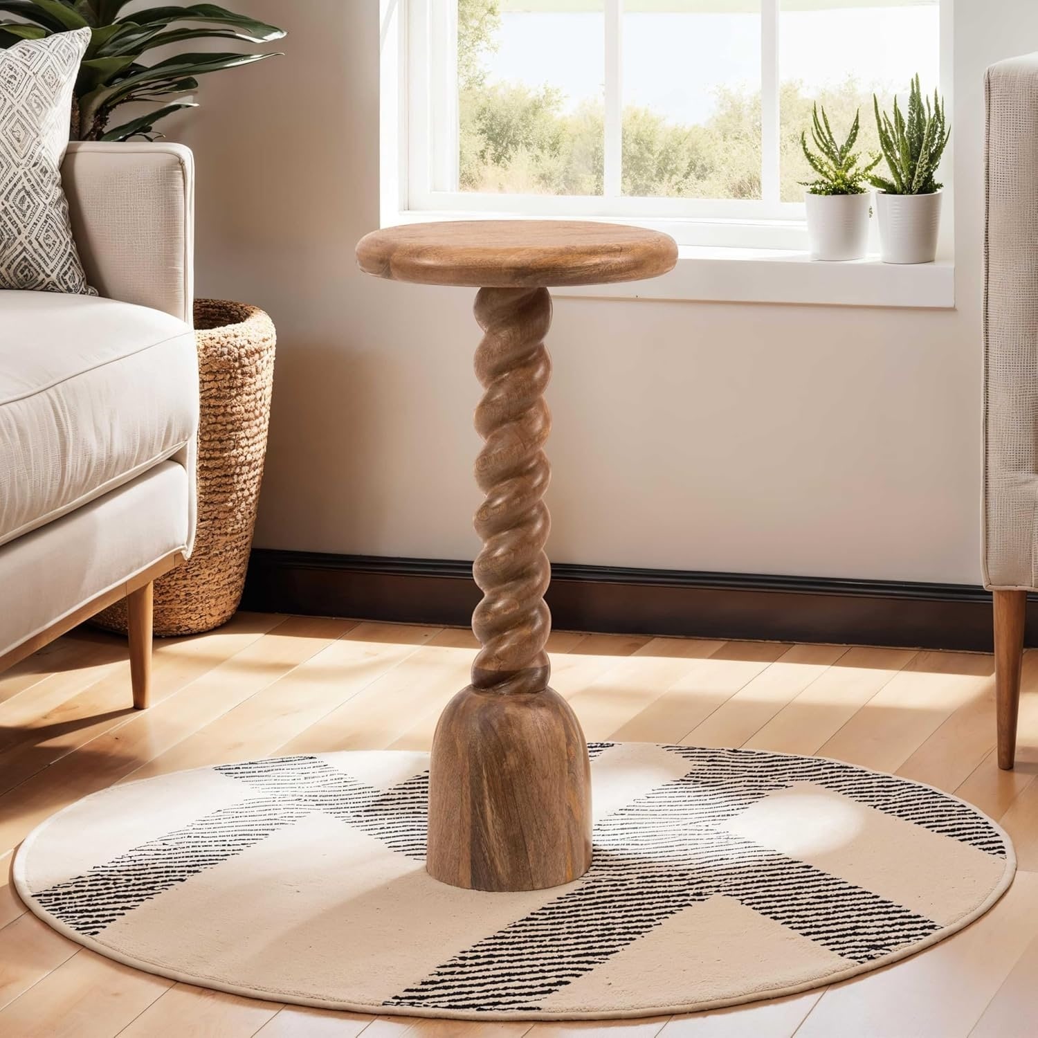 26inch Mango Wood Pedestal Side Table with Spindle Design, Natural Finish