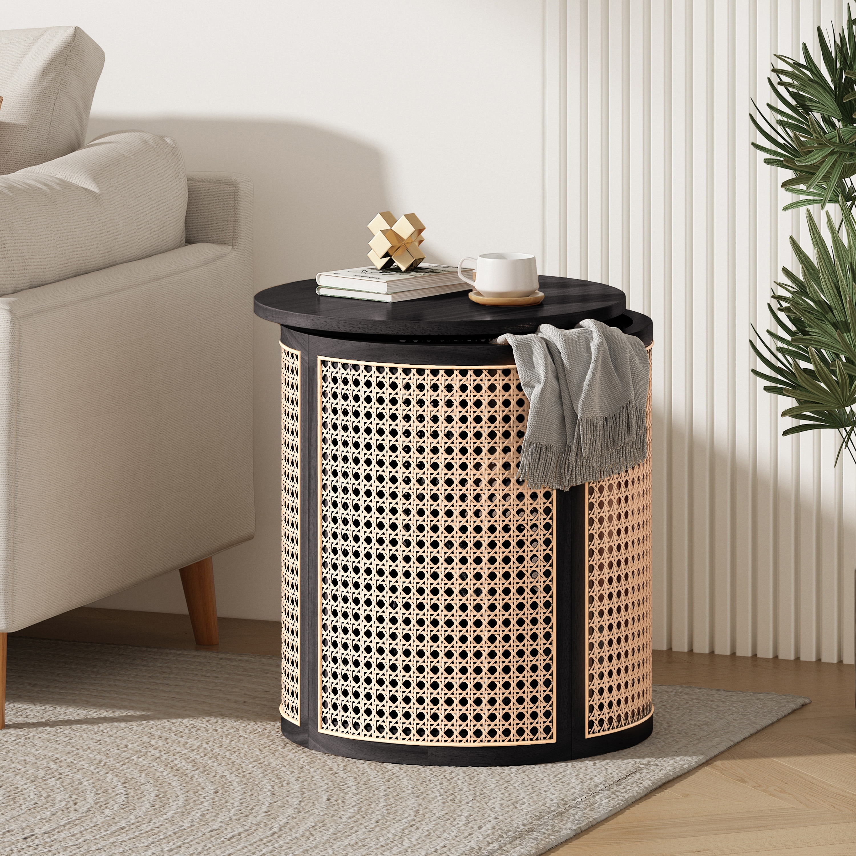 Rattan Tea Desk Round End Table Hollow Woven Side Table Chic Accent Table with Round Wood Tabletop and Flip Top Storage