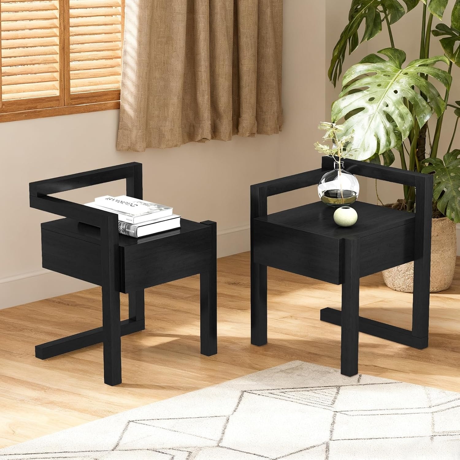 Natural Oak Wood Finish & Matte Black Accent Side Table with Storage, Set of 2