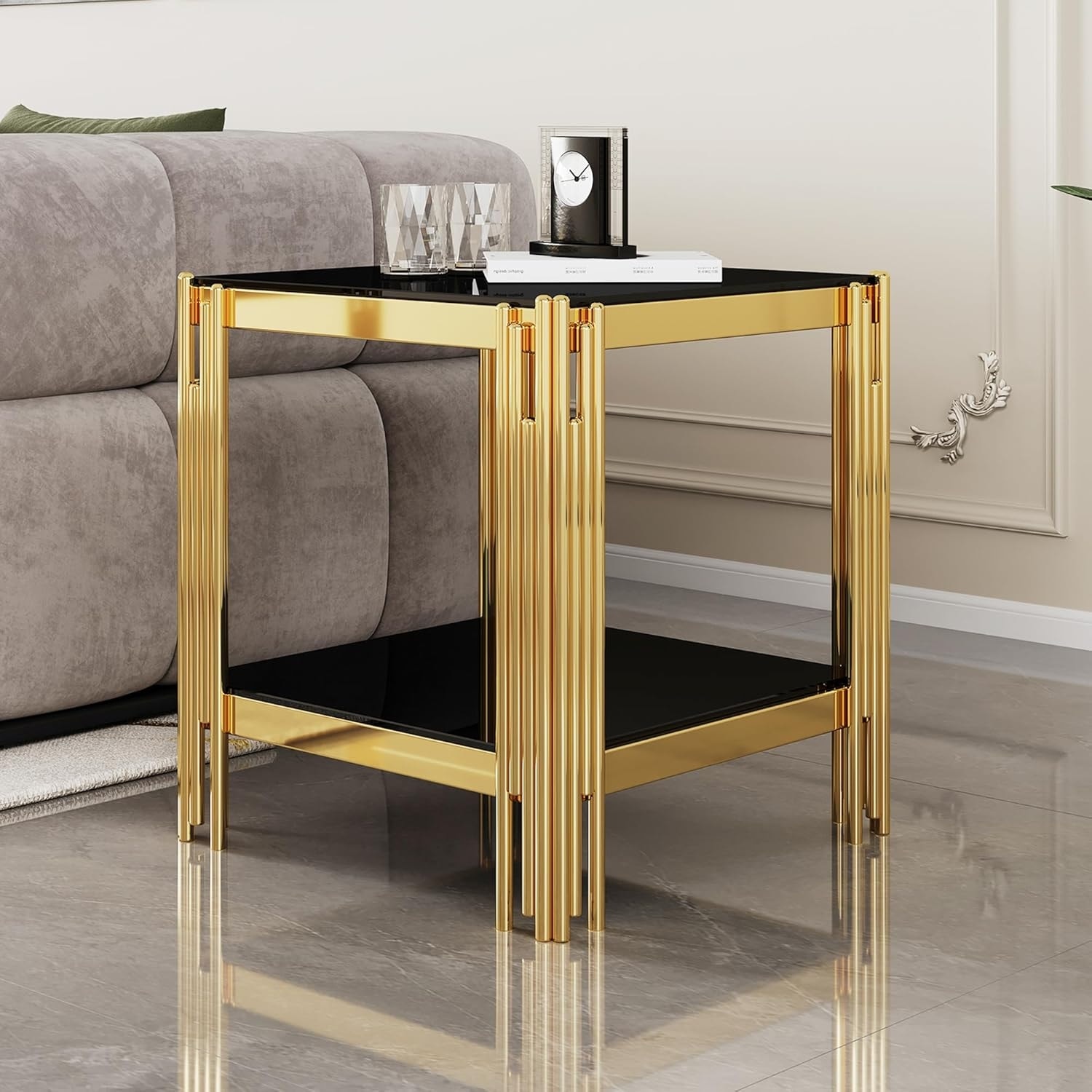 Modern 2-Tier Glass End Table with Gold Stainless Steel Legs, Small Side Table with Storage Shelf for Living Room or Bedroom