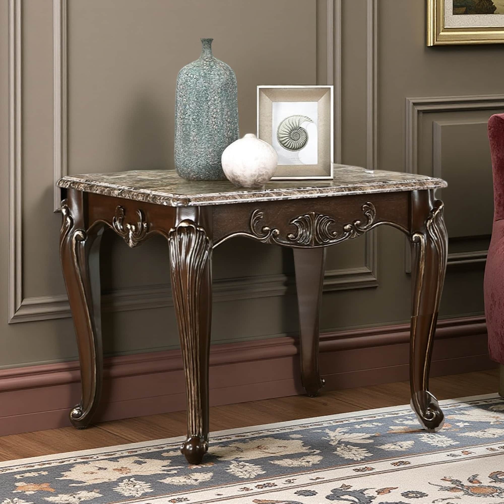 28" Marble Top Cherry Finish End Table - Formal Traditional Luxury Living Room Furniture