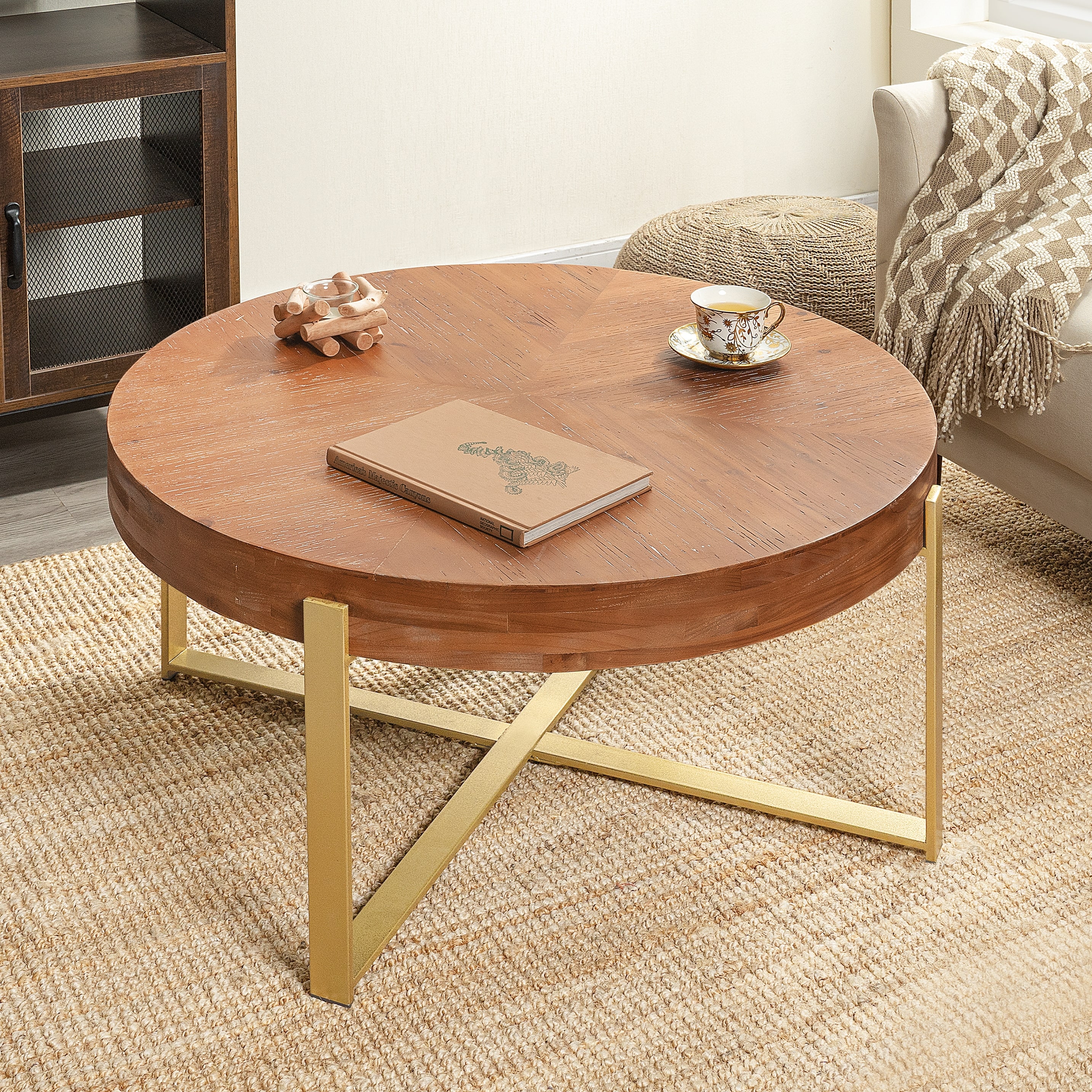 33.86" Modern Retro Splicing Round Coffee Table: Fir Wood Top & Gold Cross Legs Base