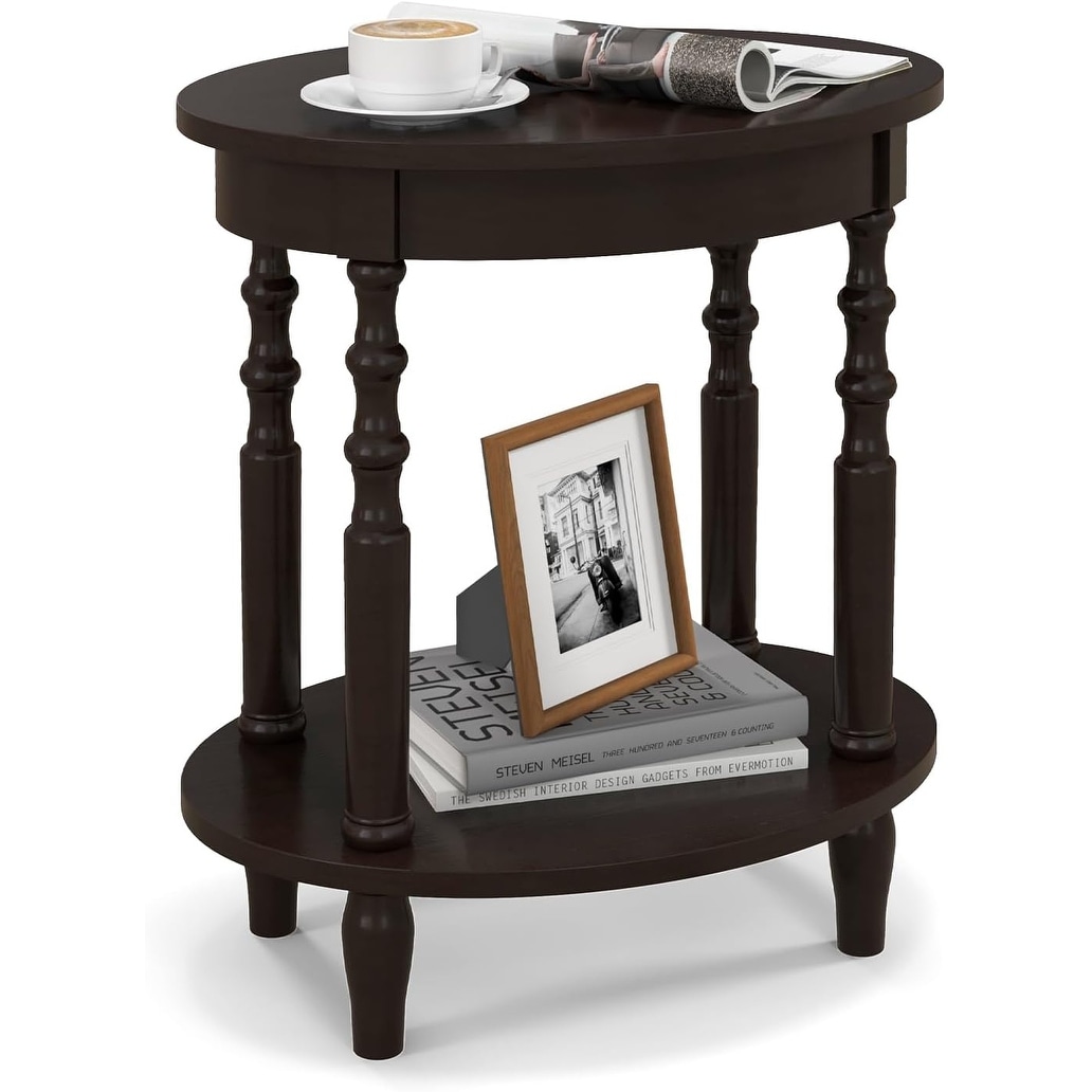 Vintage 2-Tier Oval Side Table with Storage Shelf, Rubber Wood Legs for Living Room, Bedroom, Office
