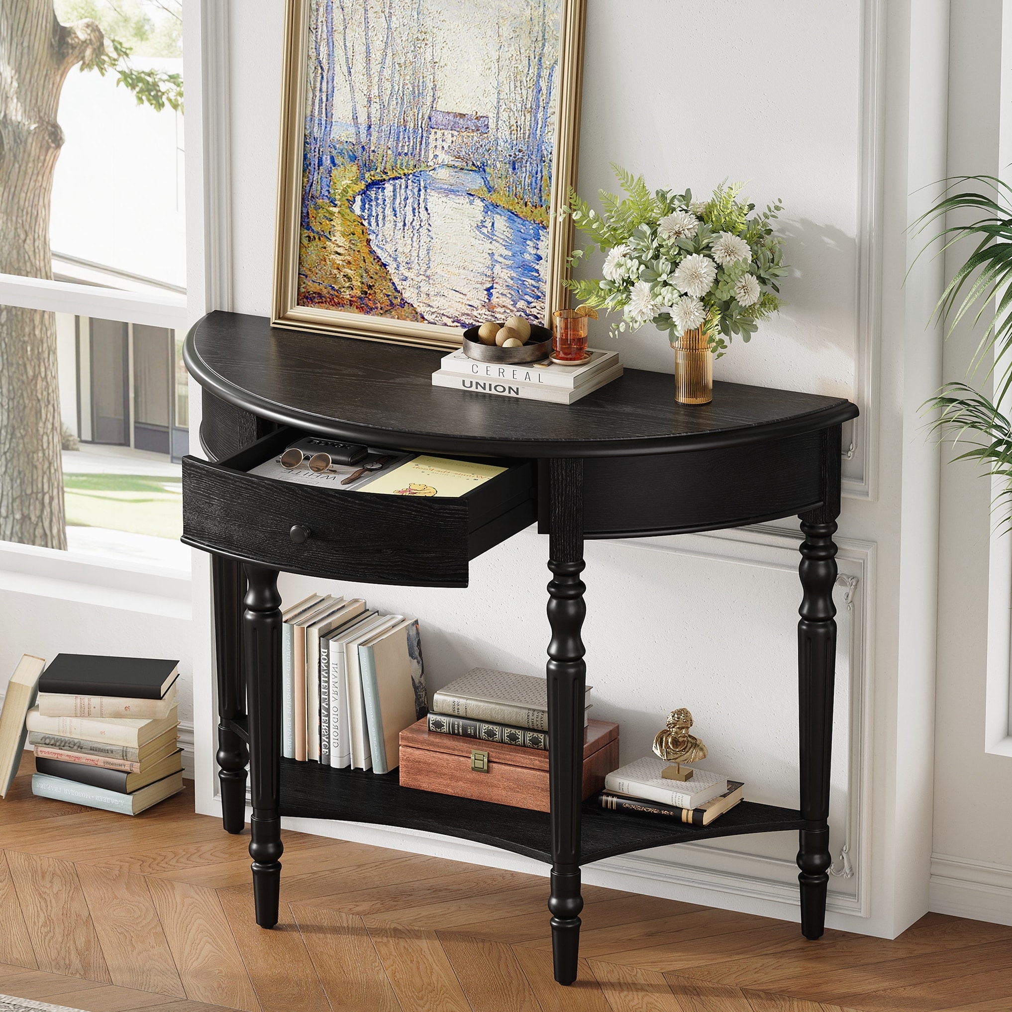 Farmhouse Half Moon Console Table with Drawer & Shelf - Rustic Accent Table