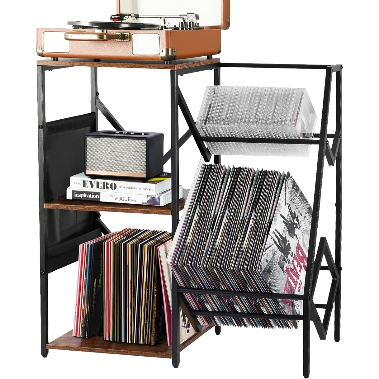 3-Tier Tall End Table with Storage for Vinyl Records, Rustic Brown Narrow Side Table