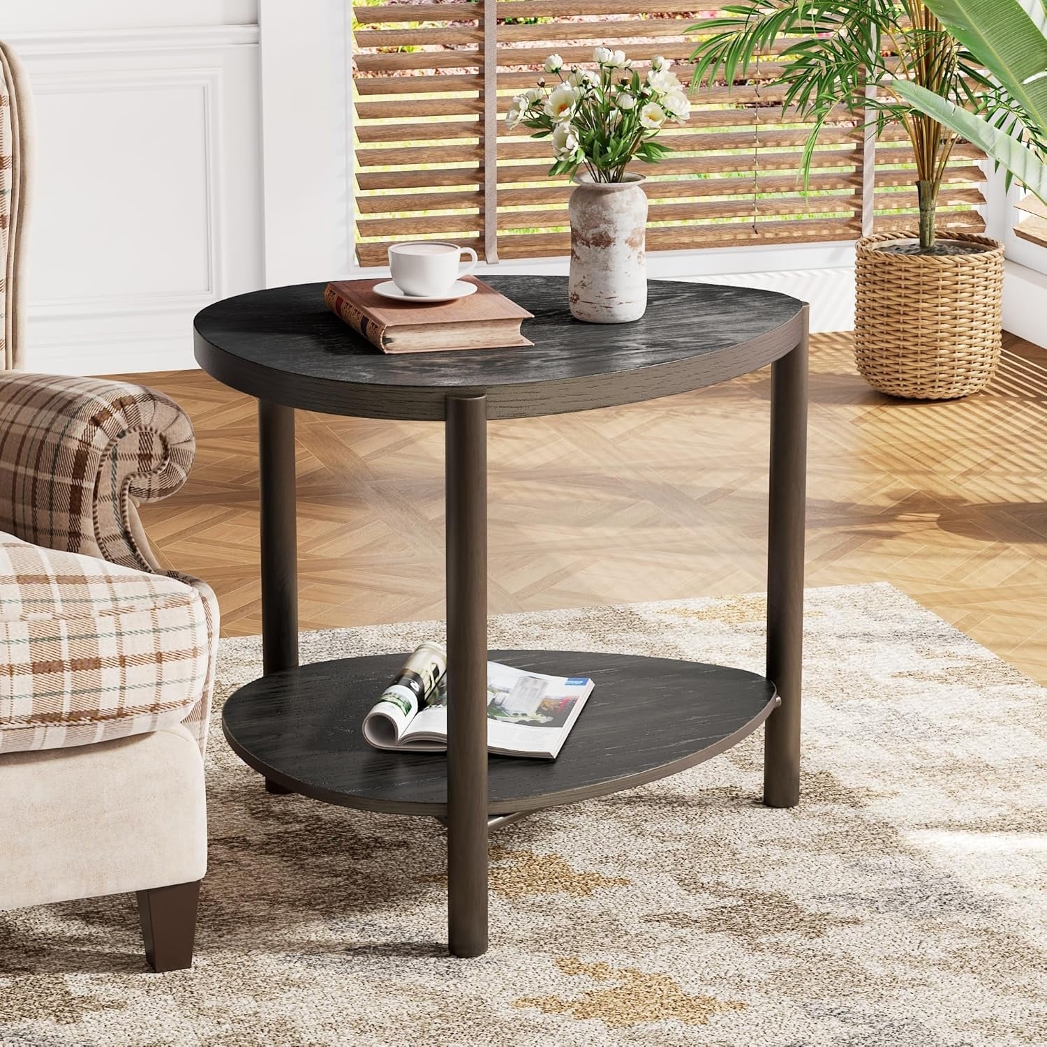 Modern Rustic 2-Tier Solid Wood End Table with Storage, Waterdrop-Shaped Nightstand for Bedroom or Living Room, Black
