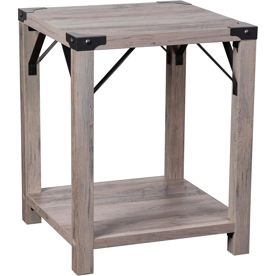 Modern Farmhouse 2-Tier Side Table with Gray Wash Finish and Black Metal Accents