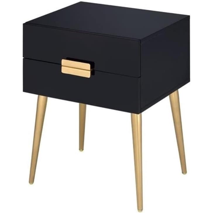 Rectangular Wooden End Table with 2 Drawers, High Gloss Top & Metal Tapered Legs