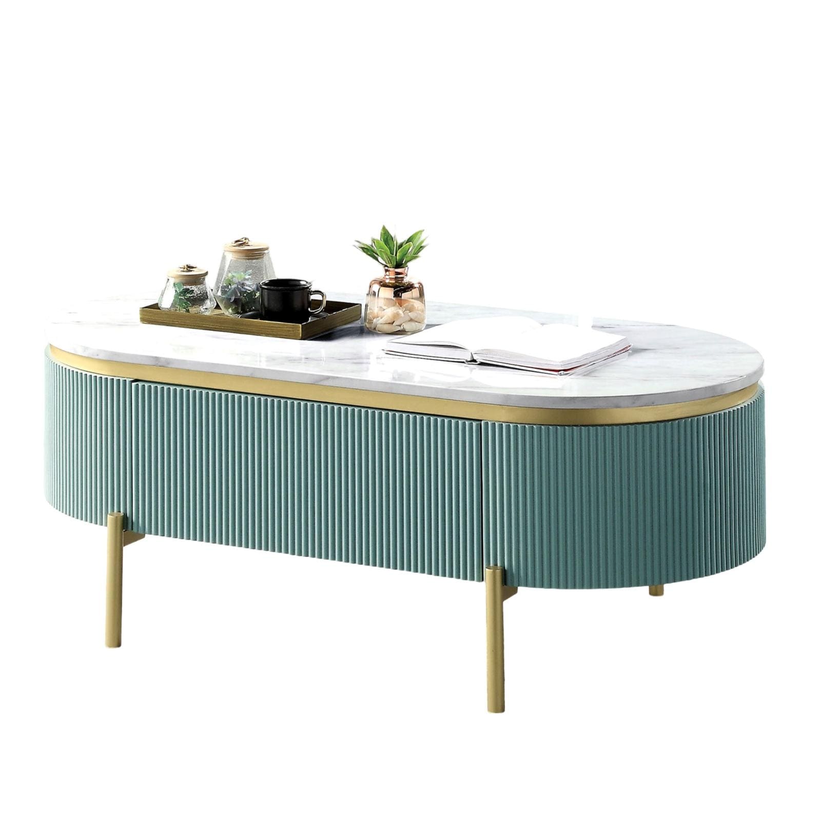 Glam Contemporary Light Teal Coffee Table With White Faux Marble Top And Drawer