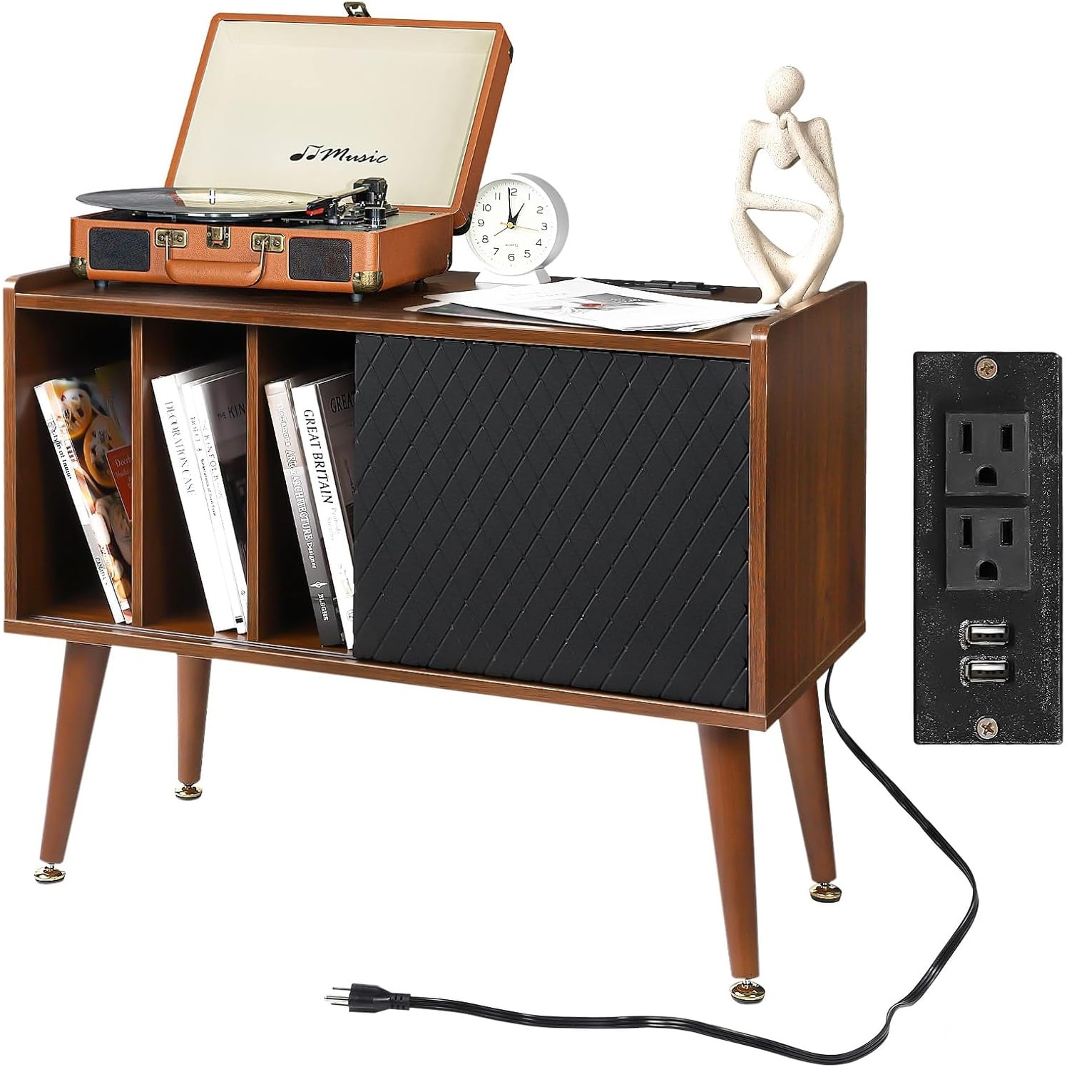 Multifunctional Vinyl Record Storage Cabinet with Charging Station, Rustic Brown Turntable Stand for Living Room or Bedroom