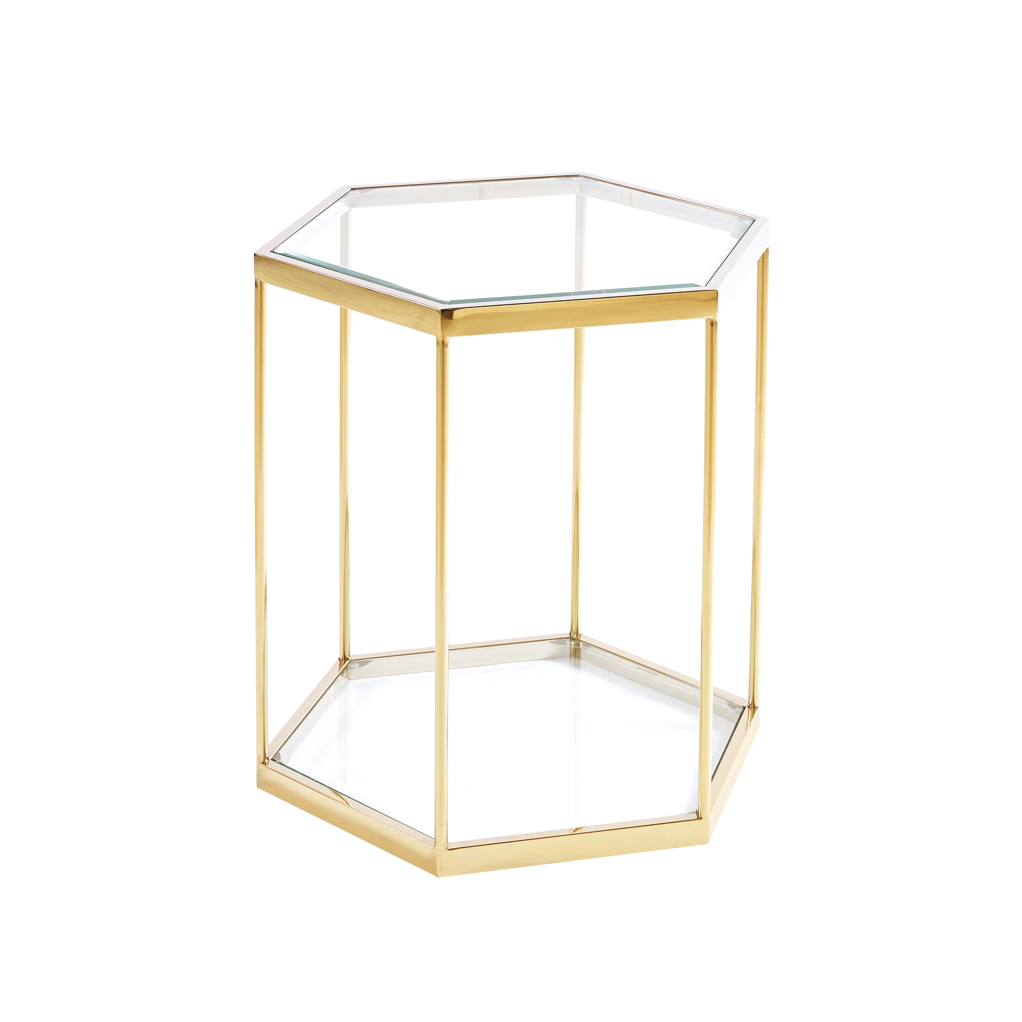 Contemporary Weathered Grey Accent Table with Clear Sides and Metallic Accents, U-Shaped Sofa Slide Design