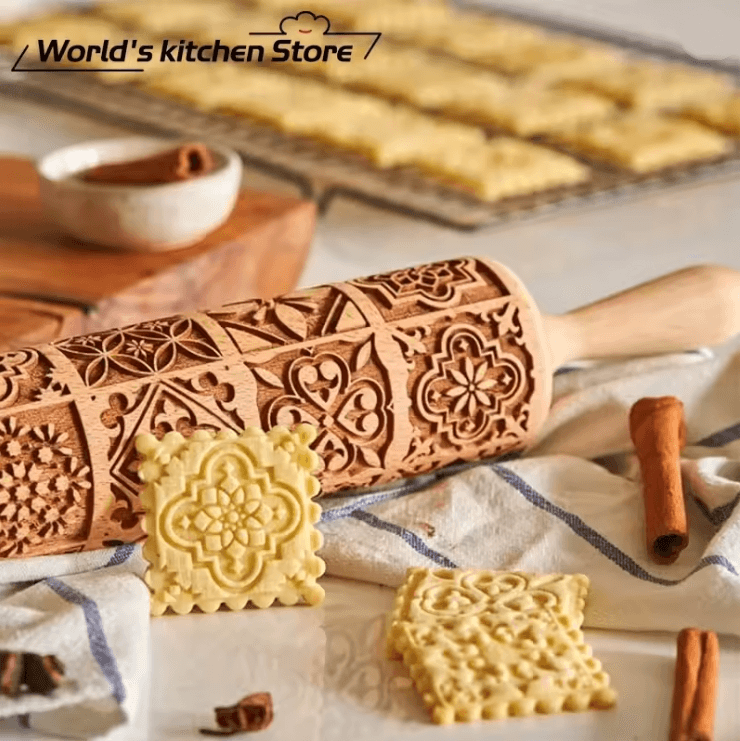 European Retro Flower Embossed Wooden Rolling Pin Deep Engraved 3D Cookie Mold For Baking style 1