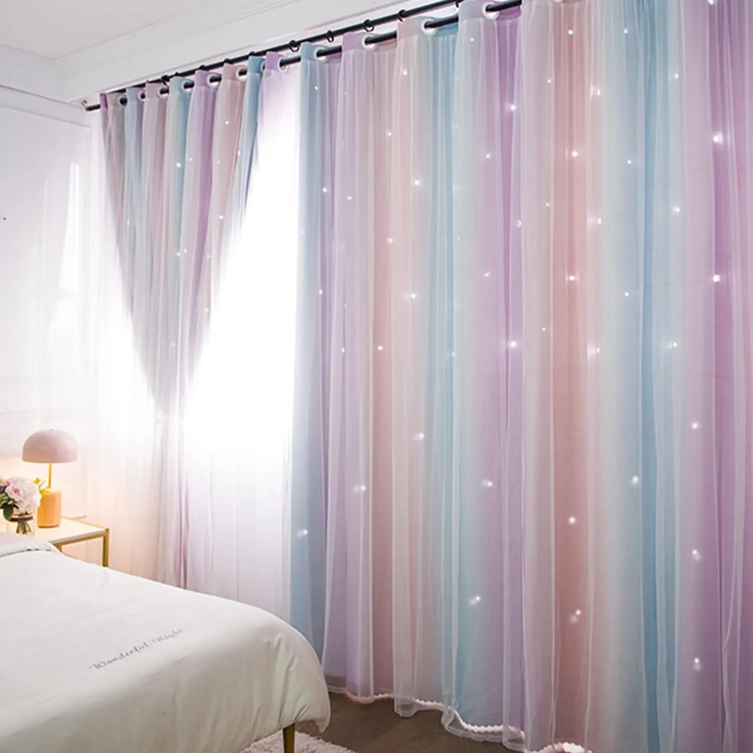Colorful Rainbow Star Curtains For Kids Room pink Purple Yellow single 52x108 In