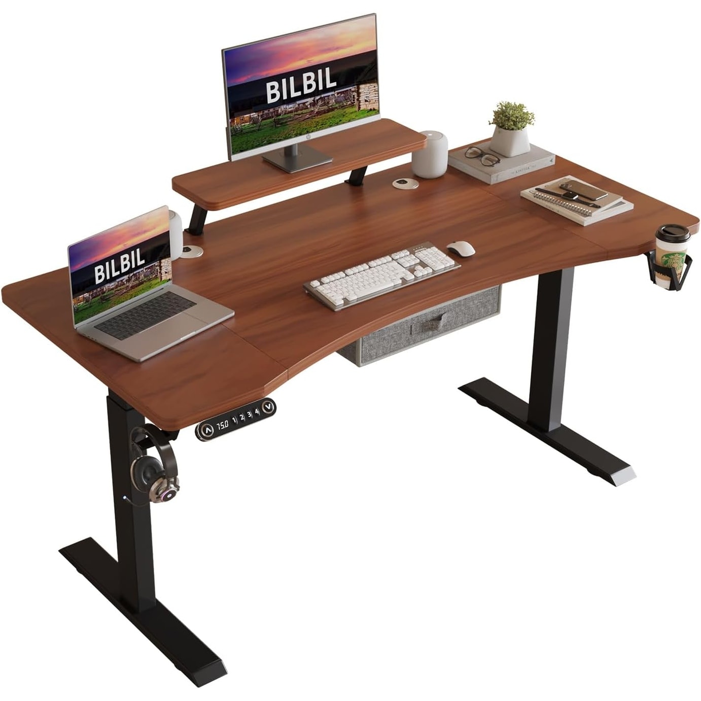 63x30 Inches Dual Motor Adjustable Height Electric Standing Desk with Drawer and Storage Shelf, Dark Walnut Top/Black Frame