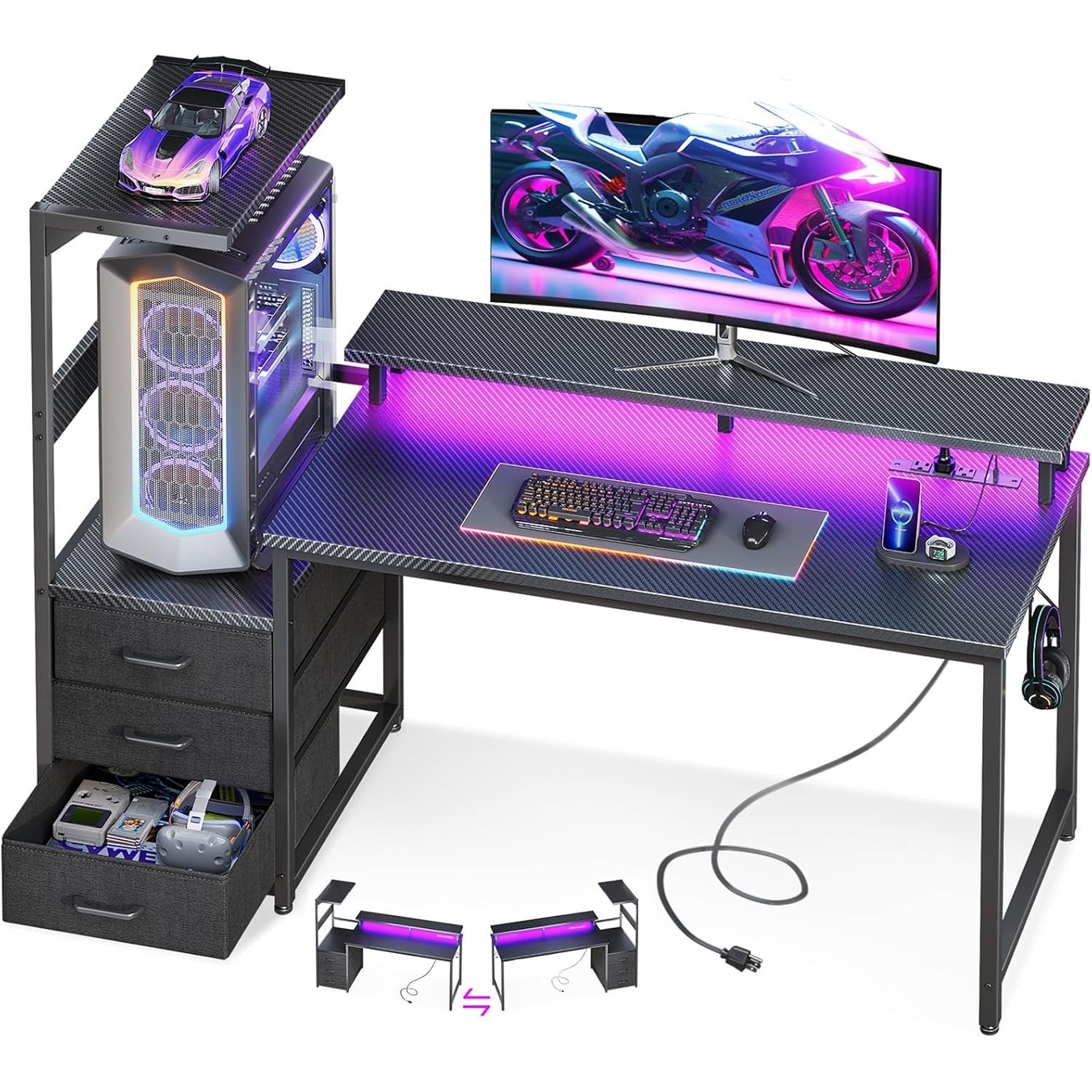 48 Inch Gaming Desk with LED Lights, Power Outlet, Storage Shelves, and Carbon Fiber Surface