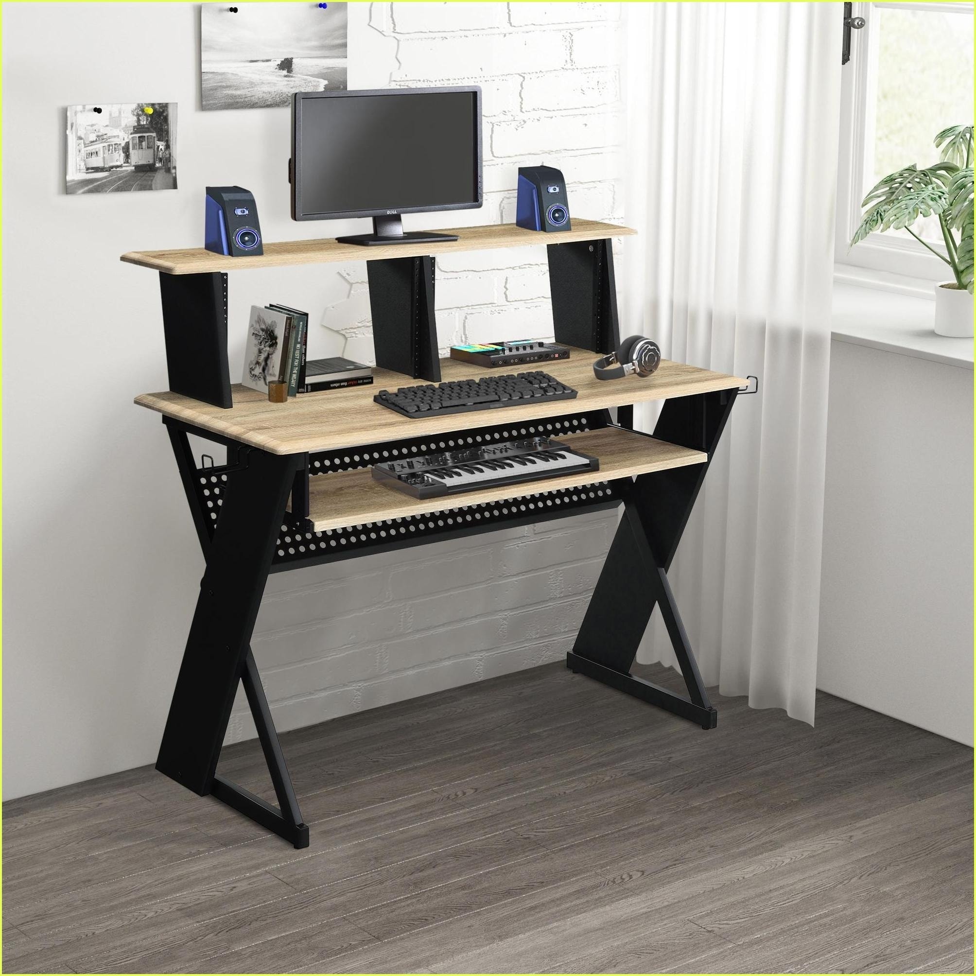 Desk for Musicians with Cord Management, Keyboard Tray and Hutch, Natural and Black, Wood + Metal