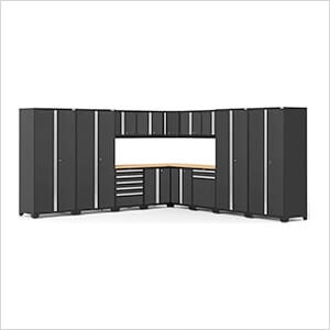 NewAge Garage Cabinets PRO Series Black 16-Piece Corner Set with Bamboo Tops and LED Lights