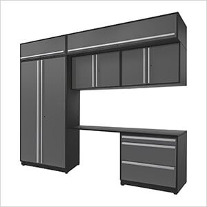 Proslat Garage Cabinets 7-Piece Glossy Grey Cabinet Set with Silver Handles and Powder Coated Worktop
