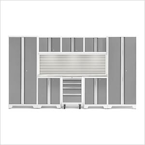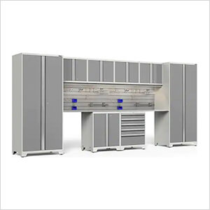 NewAge Garage Cabinets PRO Series Platinum 10-Piece Set with Stainless Tops, Slatwall Hook Kit and LEDs