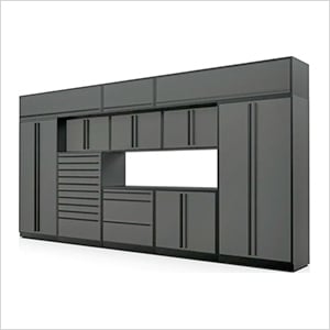 Proslat Garage Cabinets 12-Piece Glossy Grey Cabinet Set with Black Handles and Powder Coated Worktop