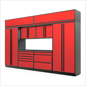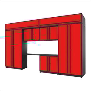 Proslat Garage Cabinets 9-Piece Glossy Red Cabinet Set with Black Handles and Powder Coated Worktop