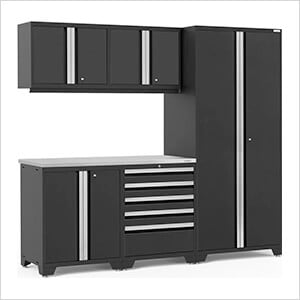 NewAge Garage Cabinets PRO Series Black 6-Piece Set with Stainless Steel Top and LED Lights