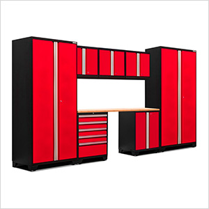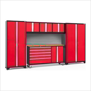 NewAge Garage Cabinets PRO Series Red 8-Piece Set with Bamboo Top and LED Lights
