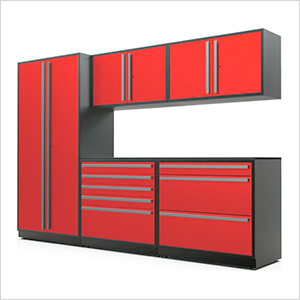 Proslat Garage Cabinets 8-Piece Glossy Red Cabinet Set with Black Handles and Powder Coated Worktop