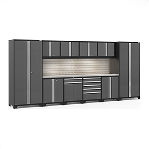 NewAge Garage Cabinets PRO Series Grey 12-Piece Set with Stainless Steel Top, Slatwall and LED Lights