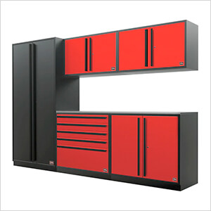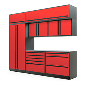 Proslat Garage Cabinets 8-Piece Glossy Red Cabinet Set with Black Handles and Stainless Steel Worktop