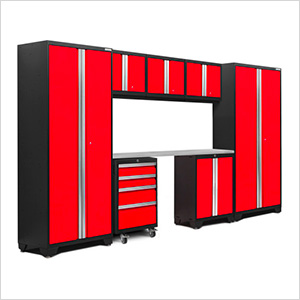 NewAge Garage Cabinets BOLD Series Red 8-Piece Set with Stainless Steel Top and LED Lights