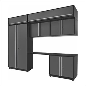 Proslat Garage Cabinets 7-Piece Glossy Grey Cabinet Set with Silver Handles and Powder Coated Worktop