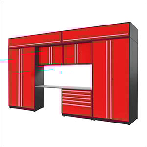 Proslat Garage Cabinets 8-Piece Glossy Red Cabinet Set with Silver Handles and Stainless Steel Worktop