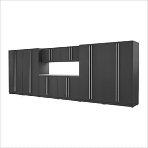 Proslat Garage Cabinets 9-Piece Mat Black Cabinet Set with Silver Handles and Stainless Steel Worktop