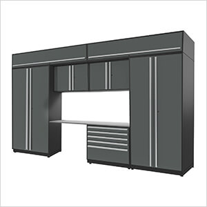Proslat Garage Cabinets 8-Piece Glossy Grey Cabinet Set with Black Handles and Stainless Steel Worktop