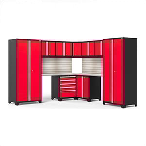 NewAge Garage Cabinets PRO Series Red 12-Piece Corner Set with Stainless Tops, Slatwall and LED Lights