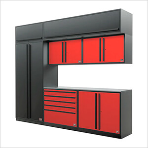 Proslat Garage Cabinets 7-Piece Glossy Red Cabinet Set with Black Handles and Stainless Steel Worktop