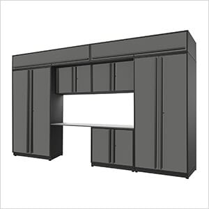 Proslat Garage Cabinets 9-Piece Glossy Grey Cabinet Set with Black Handles and Powder Coated Worktop