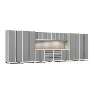 NewAge Garage Cabinets PRO Series Platinum 14-Piece Set with Bamboo Top, Slatwall and LED Lights