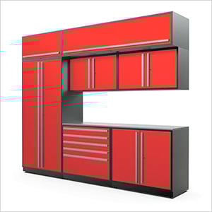 Proslat Garage Cabinets 8-Piece Glossy Red Cabinet Set with Silver Handles and Stainless Steel Worktop